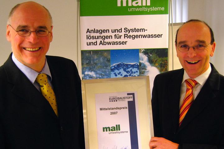 Die Mall GmbH im Donaueschinger Stadtteil Pfohren ist von der Fachgruppe Tiefbau der Fachhandelskooperation "Eurobaustoff" (Sitz Bad Nauheim) mit dem "Mittelstandspreis 2007" ausgezeichnet worden. Fachbereichsleiter Hans-Jörg Gelwitzki überreichte den Preis an den Vertriebs- und Marketingleiter der Mall GmbH, Markus Böll, im Rahmen des Fachgruppenabends in Wiesbaden. Mall verkauft seine Produkte seit vielen Jahren über den Baustoffhandel und hat sich wiederholt eindeutig zu dieser Vertriebsschiene bekannt.