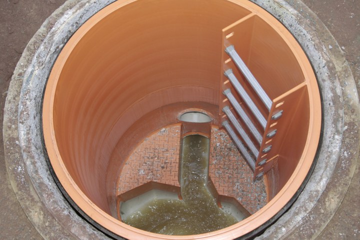 Die nachhaltige Lösung von REHAU ist die Sanierung mit hochwertigen PP-Schächten DN 1000 und DN 800. Bei der Schacht-in-Schacht-Sanierung wird in den bestehenden, zu sanierenden Betonschacht ein AWASCHACHT der nächst kleineren Nennweite eingesetzt. Der alte Schacht verbleibt als sogenannte "verlorene Schalung" im Boden. Das vorhandene und meist beschädigte Gerinne wird ausgestemmt und durch ein präzise vorgefertigtes PP-Gerinne ersetzt. Mittels Absperrblasen wird das AWASCHACHT-Unterteil schließlich sohlgleich zum Kanalrohr ausgerichtet. Der noch verbleibende Ringspalt zwischen neuem und altem Schacht wird mit hydraulisch abbindendem Spezialvergussmörtel ausgegossen. Es entsteht ein neuer, wasserdichter Schacht, der nicht nur statisch selbsttragend, sondern auch chemisch und thermisch belastbar ist.