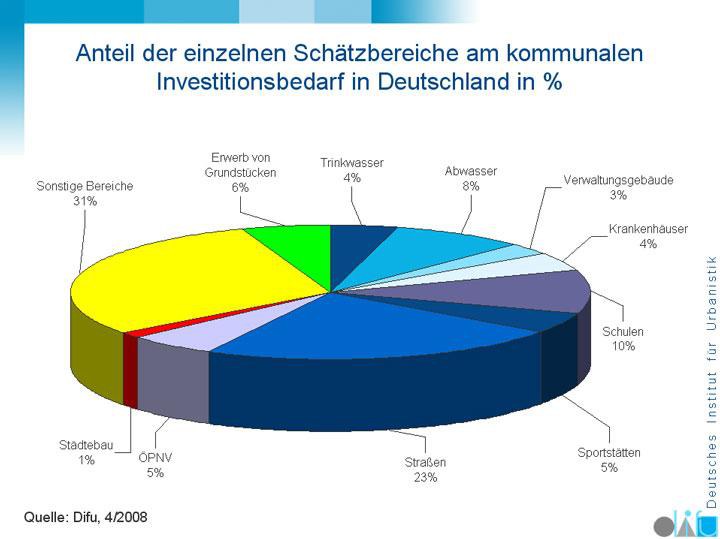 Schätzungen wurden für eine Reihe kommunaler Infrastrukturbereiche - darunter die "großen Bereiche" wie Straßen, Abwasserbeseitigung und Schulen - getrennt vorgenommen, wobei nach neuen und alten Bundesländern unterschieden wurde. Für die Jahre 2006 bis 2020 wurde insgesamt ein kommunaler Investitionsbedarf von 704 Mrd. Euro ermittelt. Dies entspricht jährlichen Investitionen in Höhe von etwa 47 Mrd. Euro (pro Kopf sind das in den alten Bundesländern 755 Euro; in den neuen Bundesländern und Berlin 858 Euro). Im Vergleich: 2005 wurde ein Investitionsvolumen von rund 40 Mrd. Euro erreicht.