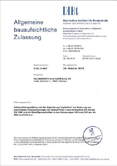 Das Deutsche Institut für Bautechnik (DIBt) hat der RELINEEUROPE Liner GmbH & Co. KG zum Mai 2010 jetzt auch die allgemeine bauaufsichtliche Zulassung für große Durchmesser des lichthärtenden Alphaliner-Schlauchliningverfahrens erteilt. Die aktuelle Zulassung mit der Nummer Z-42.3-447 bezieht sich auf die Verfahren Alphaliner 500 und Alphaliner 1200 zur Sanierung von Kreis- und Eiprofilquerschnitten im Nennweitenbereich von DN 150 bis DN 1200 sowie Eiprofilquerschnitte in den Abmessungen von 200 mm/300mm bis 900 mm/1350 mm.