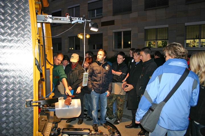 Wie gut die Aktion bei den Gästen aus der Metropolenregion Nürnberg-Fürth-Erlangen ankam, bewiesen die langen Warteschlangen vor dem Basisfahrzeug, von dem aus der Roboter über eine Videokamera gesteuert wird. Der Name KA-TE steht für millimetergenaues und treffsicheres Arbeiten bei der Sanierung von Kanalsystemen.