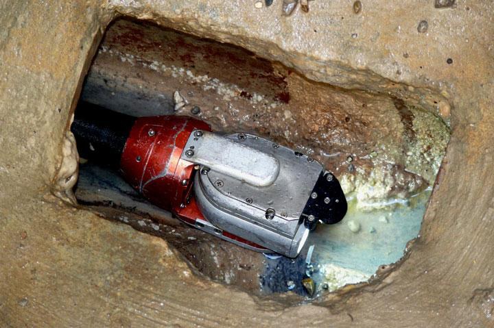 Die Untersuchung der -wie sich letztlich heraus stellte- rund 375 Meter Privatleitungen fand gegen die Fließrichtung von zwei unterschiedlichen Kontrollschächten des Netzes aus statt. Dabei drang die Lindauer Schere im Einzelfall bis zu 65 Meter weit vor und überwand dabei zwei Abzweige nacheinander. Das unterirdische Abbiegen wird dem Kamerakopf durch eine ein- und ausfahrbare Scherenmechanik ermöglicht, mit der sich das Gerät in Anschlüsse quasi "hineintastet", um dann weiter in diese einzudringen - bis zum Leitungsende oder bis zum nächsten Abzweig. Die Kamera wird dabei entweder geschoben oder durch den integrierten Hydraulikantrieb per Rückstoß eingespült, wobei sich in Eching, (wie in vielen anderen Anwendungsfällen auch) der Spülantrieb als die günstigere Option erwies: Er ermöglicht nicht nur deutlich größere Reichweiten der Kamera, sondern sorgt für eine automatische Grundreinigung der Leitungen vor der eigentlichen Inspektion, die dann beim Zurückziehen der Lindauer Schere erfolgt.