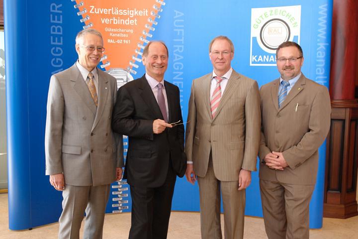 In seiner Begrüßungsrede ging Vorstandsvorsitzender Thymian auf die Entwicklung der Gütegemeinschaft ein. Die positive Bilanz: Die Zahl der Mitglieder erhöhte sich von 3.134 auf 3.184. Für Thymian ein positives Signal "trotz der nach wie vor schlechten (bau-)wirtschaftlichen Lage", wie der Vorstandsvorsitzende feststellte. In Bezug auf den Güteschutz Kanalbau konnte Thymian mit weiteren beeindruckenden Zahlen aufwarten: 435 Gütezeichenanträge wurden 2009 gestellt. 4.798 Auftraggeber und Ingenieurbüros hatten Ende des Jahres die Anforderungen der Gütesicherung RAL-GZ 961 in ihre Ausschreibungen aufgenommen. 911 Auftraggeberbesuche, 40 Auftraggeber-Fachgespräche, 1.823 Firmenbesuche sowie 20 Messe- und Kongressbeteiligungen dokumentieren die Tätigkeit der Mitarbeiter in der Geschäftsstelle und der vom Güteausschuss beauftragten Prüfingenieure. Diese besuchten 3.343 Baustellen im Rahmen der Gütesicherung.