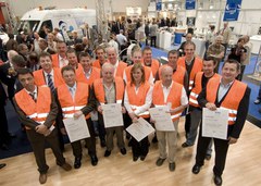 Ein denkwürdiger Tag für die Abwasserbranche und den Verband Deutscher Rohr- und Kanal-Technik-Unternehmen (VDRK e.V.): Am 6. Mai 2008 wurden auf der IFAT 2008 in München die ersten Meister des Berufsbildes "Fachkraft für Rohr-, Kanal- und Industrieservice" in den Arbeitsmarkt verabschiedet. Von den 24 Teilnehmern der Vorbereitungslehrgänge konnten 17 Meisterschüler, darunter eine Frau, Ihre Meisterbriefe während der Feierstunde auf dem IFAT-Stand der IBAK GmbH in Empfang nehmen. Für den VDRK, auf dessen Initiative Schaffung und Ausgestaltung des neuen Berufsbildes maßgeblich zurückgehen, ein historischer Erfolg.
