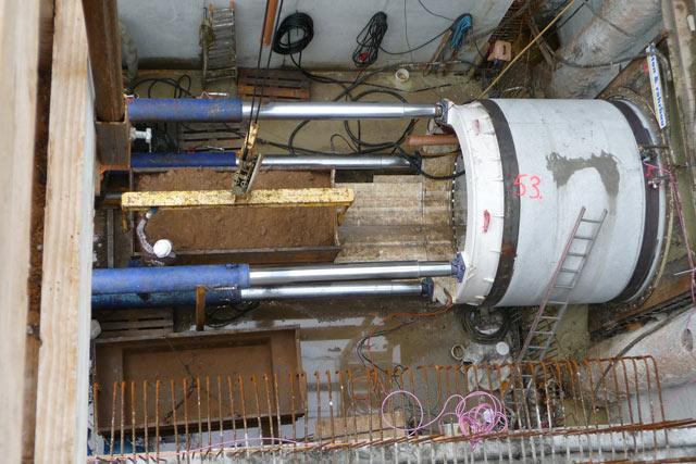 Nach Aussage von Dipl.-Ing. Johann Reichardt, Technischer Leiter Rohrvortrieb, beton & rohrbau C.-F. Thymian GmbH & Co. KG, stellte vor allem der enorme Kurvenverlauf der Haltung die besondere Herausforderung der Vortriebsmaßnahme dar. "Der Verlauf des neuen Stauraumkanals orientiert sich am Verlauf der Ludwig-Guttmann-Straße", so Reichardt. "Von der 17 m tiefen Startgrube aus – aufgrund ihrer Lage in unmittelbarer Nähe der Neckarböschung wurde sie zur Aufnahme der Druckkräfte der Vortriebsmaschine mit einer im Erdreich verankerten Presswand und einer 80 cm starken Bodenplatte ausgestattet – verlief die Strecke ungefähr 50 m schnurgerade. Auf den nächsten 120 m folgte dann eine Kurvenfahrt mit einem Radius von 225 m, bevor das Schlussstück wieder gerade aufgefahren werden konnte." Hieraus ergaben sich besondere Anforderungen an Technik und Material. "Je enger der Kurvenradius ausfällt, desto größer wird die Fuge an der Außenseite der Vortriebsrohre, zudem nehmen die Vortriebskräfte deutlich ab", erläutert Reichardt. "Bei solchen Rahmenbedingungen kann man entsprechend dem DWA A 161 entweder nur kürzere Rohre einsetzen, was aufgrund des baulichen und logistischen Mehraufwandes zu höheren Baukosten führt, oder auf eine andere Druckübertragungstechnik setzen." Das haben die Tiefbauspezialisten in Heidelberg getan.