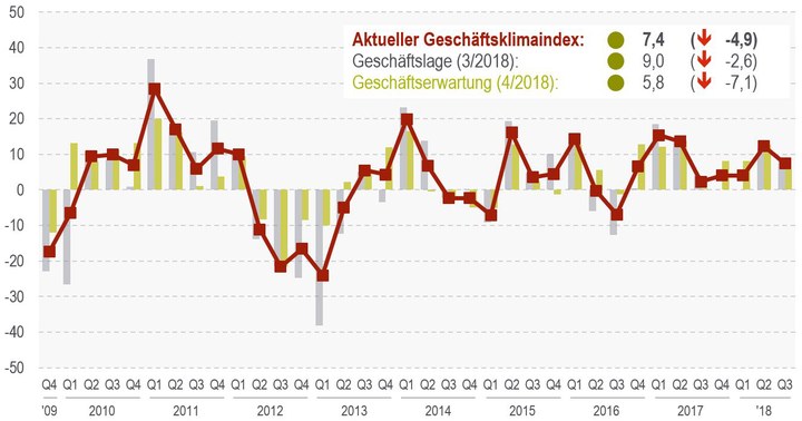 Mit einem Wert von 9,0 liegt der Index für die Geschäftslage im 3. Quartal 2018 nur knapp unter dem Niveau des Vorquartals (Index 11,6).
