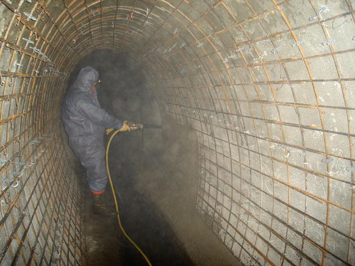 Ein Maulprofil mit einer Trockenwetterrinne in den Dimensionen (Breite = 1,15 m und Höhe = 2,12 m) wurde durch die Sanierungstechniker im zweiten Abschnitt von ca. 10 m instand gesetzt. In diesem Abschnitt verzeichnete man stärkere Korrosions-erscheinungen, so dass bei der Vorbereitung der Beschichtungsarbeiten mittels Höchstdruckwasserstrahlen ein Betonabtrag von ca. 60-70 mm zu verzeichnen war. Die Arbeiten erfolgten im Schutz einer zuvor erstellten Schutzrüstung, da durch die Auflage des Auftraggebers der Bahnbetrieb stets aufrecht gehalten werden musste. Der Auftrag der Oberflächenschichten erfolgte in 5 Lagen mit doppelter Bewehrung bis zu einem Gesamtaufbau von 180 mm.