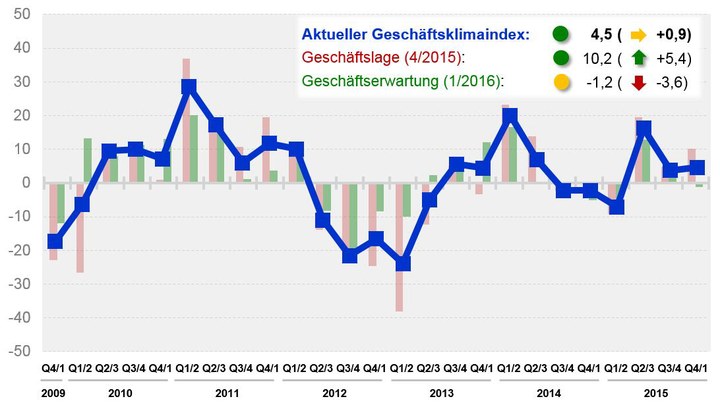 Mit Ablauf des 4. Quartals 2015 liegt der Geschäftsklimaindex der Kunststoffrohr-Industrie zum dritten Mal in Folge im positiven Bereich. So liegt der Index – als Aggregation aus Geschäftslage und Geschäftserwartung – mit einem Wert von 4,5 in etwa auf dem Niveau des 3. Quartals und bleibt zum dritten Mal im positiven Bereich.