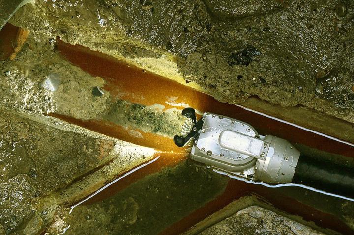 Optional ergänzt um ein hydraulisches Antriebsmodul, vermag die Schere auch starke Verschmutzungen und Inkrustationen im Zuge der Inspektion zu beseitigen. Einerseits ist eine Inspektion verschmutzter Leitungen weder normgerecht noch sinnvoll, zum anderen spült sich die Schere vielfach selbst überhaupt erst den Weg für die weitere Untersuchung frei. Gerade unter der Villa 2 war dies unbedingt notwendig, da die Leitungen teilweise bis auf ca. ein Drittel des Restquerschnittes vom verhärteten Schmutz der Jahrzehnte inkrustiert waren. Ohne Reinigung wäre eine Untersuchung also gar nicht möglich gewesen.