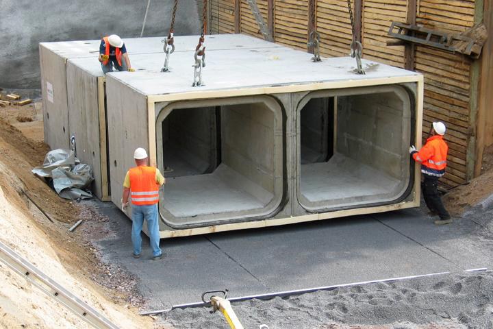 Die Baumaßnahme stellte sehr hohe Anforderungen an die Logistik und die Ausführung vor Ort. "Bedenkt man, dass für den Transport eines jeden Stahlbetonprofils mit einem Gewicht von 37 t ein Schwerlastfahrzeug notwendig war und die Gesamtkreuzungslänge ca. 46 m betrug, so musste vom Herstellerwerk in Münster bis zum Einbau in der Baugrube jeder Arbeitsschritt genauestens geplant werden", fasst Dewes die spektakulären Aktionen des Wochenendes zusammen. Auch das Einheben eines solchen Kolosses erfordert größte Präzision und eine sorgfältig vorbereitete Baugrube. Erwartungsgemäß klappte das Verlegen der 17 Schwergewichte reibungslos. Dazu beigetragen haben so genannte Zentrierbolzen, mit denen die Rechteckprofile zusätzlich ausgestattet sind. Diese ergänzende Verlegehilfe erleichtert das Zusammenführen der Profile ganz erheblich.