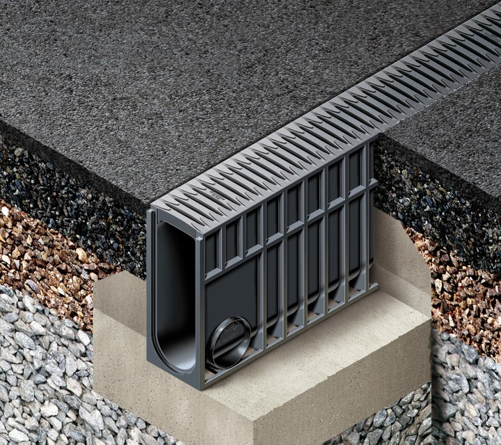 Das Entwässerungssystem wird aus einem besonders widerstandsfähigen und bruchsicheren Polypropylen gefertigt, das speziell für diesen Einsatzzweck optimiert wurde. Dies ermöglicht im Gegensatz zu monolithischen Rinnen aus anderen Werkstoffen eine äußerst kompakte und dennoch hochstabile Bauweise. Das gesamte Rinnensystem ist mit nur wenigen Komponenten komplett einsatzbereit. Zudem sind die Rinnenteile sehr leicht und gleichzeitig robust, was die Arbeiten auf der Baustelle erleichtert. Der Rinnenstrang kann durch einfaches Aneinanderfügen der Elemente im Handumdrehen vollständig fertig gestellt werden.