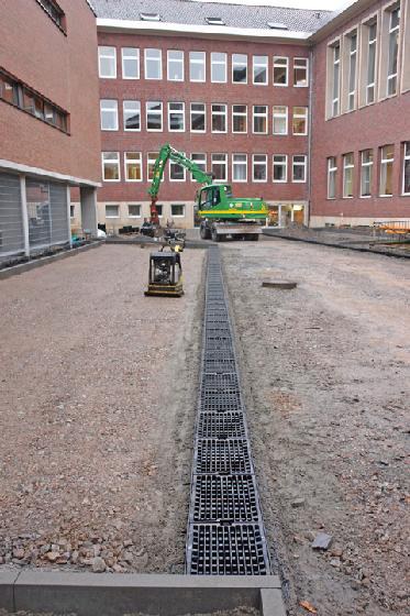 Neben den überzeugenden Produkten ist die Beratung eine Stärke des Hamm-Uentroper Kunststoffrohranbieters Funke. So begleitete Fachberater Erpenbeck die Münsteraner Baumaßnahme mit Rat und Tat und beim ersten Einbau war Anwendungstechniker Markus Leppelmann mit vor Ort. "Es war sehr gut, dass Herr Leppelmann uns beim ersten Einbau der Rinnen eine Einweisung gegeben hat. Dabei ist das Setzen grundsätzlich eine einfache Sache", fasst Polier Jürgen Wiedebusch zusammen. "Zunächst wird ausgeschachtet; danach haben wir den Unterbau aus grobsplittigem Kalkstein mit einer Körnung 8/32 mm erstellt. Dann wurde verdichtet und die Rinne gesetzt. Das Substrat wurde in Bigpacks zur Baustelle geliefert, von uns in einen Kleincontainer umgefüllt und dann mit dem Radlader verteilt."