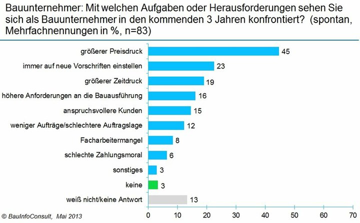 BauInfoConsult hat Telefoninterviews mit 83 Bauunternehmern dazu durchgeführt, welchen Herausforderungen sie in den nächsten drei Jahren gegenüber stehen (sie antworteten spontan). Ganz klar: Vor allem der erhöhte Preisdruck, meinen 45 Prozent der Befragten. Da geht es der Baubranche nicht besser als den anderen Branchen.