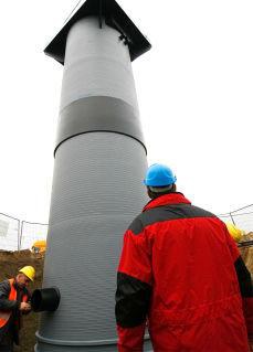 Der hat einen Gesamtdurchmesser von 2.000 mm, 10.000 mm Tiefe und wiegt 4.000 kg. Beauftragt wurde das Bauwerk durch die Berliner Wasserbetriebe, die auch Betreiber der Abwasseranlage sind. Der einzigartige Kunststoffschacht aus Polyethylen wurde monolithisch hergestellt und per Tieflader anschlussfertig auf die Baustelle geliefert. Ein Kranfahrzeug bugsierte den Riesenschacht millimetergenau in einen vorbereiteten 6 m tiefen Vortriebsschacht, der aus 2,5 m Betonringen zusammengesetzt wurde. Die Baugrube war bereits auf circa 4 m ausgeschachtet worden. Nach der Erdverfüllung wird nur noch eine klappbare Edelstahlabdeckung den Standort des Schachtes zu erkennen geben.
