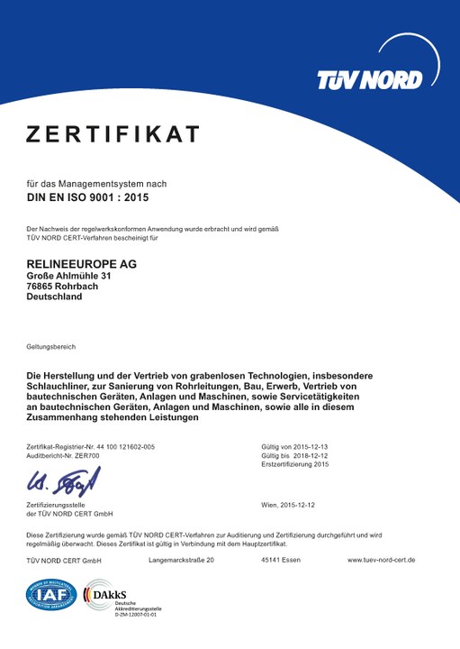 Relineeurope nach der neuen DIN EN ISO 9001:2015 zertifiziert