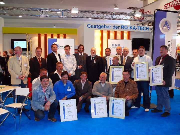Die RO KA TECH 2009 in Kassel war nicht nur eine exzellent besetzte und besuchte Fachmesse rund um den Abwasserkanal, sondern der erste offizielle Höhepunkt für die "Zertifizierten Fachkundigen für Kanaldienstleistungen". Dieses Fortbildungsprogramm, mit Ziel einer spezialisierten Qualifikation im Bereich Kanaldienstleistungen, bietet die SAG-Akademie GmbH für berufliche Weiterbildung mit Ihren Standorten in Darmstadt und Lünen, gemeinsam mit dem VDRK Verband Deutscher Rohr- und Kanal-Technik Unternehmen e.V. an. In Kassel wurden am 20.03.2009 die ersten 24 erfolgreichen Prüflinge im Rahmen einer Feierstunde geehrt.