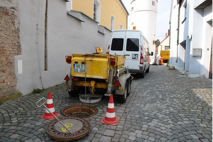 Zunächst hatte die Stadt den Schaden provisorisch repariert. Es stand allerdings fest, dass um einen Neubau bzw. eine gründliche Sanierung kein Weg vorbeiführte. Eine offene Bauweise schied dabei von vornherein aus. „Dafür liegen die Kanalleitungen zu tief im Erdreich, und auch die enge Bebauung mit Wohnhäusern sprach dagegen. Außerdem verläuft parallel zur Pulverturmgasse die historische Stadtmauer, die nur eine schlechte Gründung besitzt“, erläutert der Leiter Kanalnetz des Tiefbauamtes Neumarkt Dipl.-Ing. Ernst Schmidt die Gründe, die zur Entscheidung für ein grabenloses Sanierungsverfahren führte.