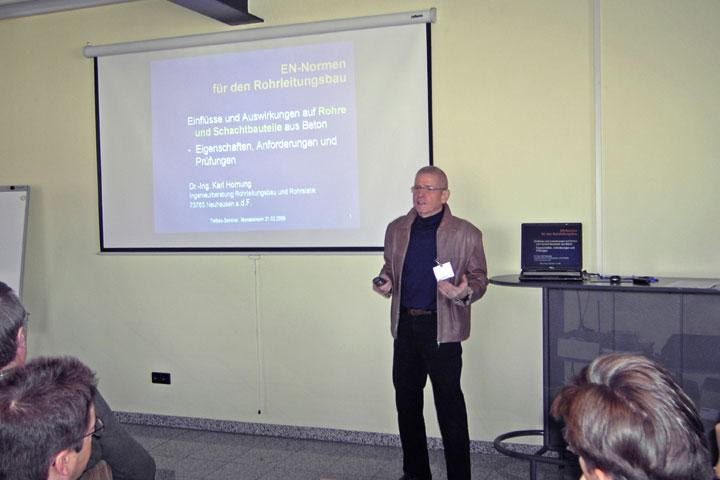 "Moderner Kanalbau aus Beton- und Stahlbeton nach den neuen DIN EN Normen" lautete der Titel einer Tagung, zu der die Zementrohr- und Betonwerke Karl Röser & Sohn GmbH aus Mundelsheim Auftraggeber, Planer sowie Vertreter aus Handel und ausführenden Unternehmen eingeladen hatte. Die Veranstaltung zählt zur Reihe der so genannten "Süddeutschen Rohrseminare" und wurde gemeinsam mit der Fachvereinigung Betonrohre und Stahlbetonrohre e.V. (FBS) organisiert.