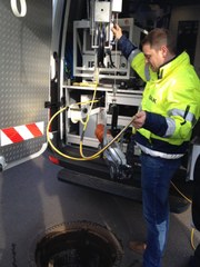 Im weiteren Verlauf führte Sebastian Felix mit der PEGASUS HD, deren eigentliches Anwendungsgebiet Großprofile sind, die Haltungsuntersuchung einer DN300 STZ RW Haltung in der Praxis vor, welche zuvor extra zu diesem Zweck gereinigt wurde. Beeindruckt verfolgten die Zuschauer die Vorführung, denn die PEGASUS HD besitzt einen Bildsensor im Full-HD-Format, der ca. fünfmal so viele Bildelemente aufweist wie ein herkömmlicher PAL-Sensor. Mit ihrer vertikalen Bildauflösung von 1080 Pixeln erfüllt die PEGASUS HD erstmalig die Anforderungen des DWA-Merkblatts M149-5 für die Inspektion von Großprofilen (z.B. Forderung bei DN1000 nach vertikaler Auflösung von mindestens 1000 Pixeln).