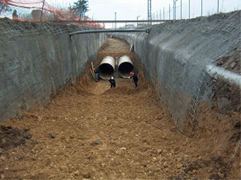 The main collector consists of two paralleling DN 2000 pipelines, a road drainage, 18 shafts for inspection and a overflow, not to mention auxiliary facilities such as road links, intersections with the railway, etc. The main technical challenge, however, was the limited width of the pipe trench and the small clearance (approx. 60 cm) between the two lines. Already in the design phase had HOBAS experts proposed a technical solution for pipe laying and backfilling, which was gladly accepted and laid down in the design. Thanks to the regular visits by HOBAS site advisors throughout the construction works, a risk of pipe buoyancy in the ferroconcrete casing running under railway lines was recognized and averted with an appropriate technical solution. HOBAS also shared its valuable international expertise when it came to testing the line after its successful installation.