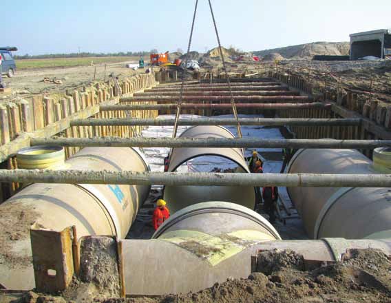 A total of 9 tanks with a capacity of 266 to 854 m3   each were delivered. The storage tanks size was chosen to match the expected water volume including also a possible surcharge of 10% and some extra volume for emergency situations. They comprise 2 to 3 pipes DN 3000, 13 to 62 meters in length. The delivery also included insection manholes.