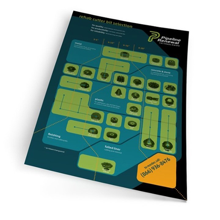 Pipeline Renewal Technologies has released a new Rehab Cutter Bit Selection poster. It serves as a visual guide for sewer rehab workers to follow when identifying the best cutter bit to use in any given sewer pipeline rehabilitation project. The poster outlines the optimal conditions for each cutter bit, and organizes bits by pipe size, pipe material and cutting task. As rehab contractors know, choosing the right bit increases productivity, generates better results, reduces bit wear, and can spare cutting robots needless extra punishment.