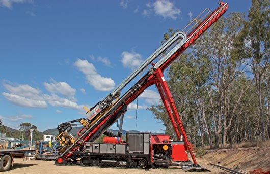 In the summer of 2012, the two drill rigs were shipped from Hamburg. The sea passage to Brisbane took all of 45 days. Since that time, the drill rigs are in action. They perform drilling operations called horizontal blind bore holes with diameters of 3 ½”, a drill length up to 1,800 m and a drill depth up to 350 m. The previously established vertical bore holes have to be connected with the horizontal bore holes, therefore they are equipped with reference transmitters to allow the horizontal drill rig to pick up the signals and drive towards them. In order to reach a vertical bore hole in a depth of 200 m, the cut-in must be smaller than 45° in a distance 200 m away from the vertical hole. As soon as the installation depth in the cover layer of the coal strata is reached, the drill moves forward from one vertical bore hole to the next until it arrives at the target. Then a casing pipe is pushed in up to the bore head. Finally the drill stems with the bore head are recovered under the protection of the casing pipe. Now filter pipes are driven into the empty casing pipes. This is carried out with special rollers which are mounted to the first pipe and driven by means of hydraulics. The drilling process is completed as soon as the casing pipes are pulled out.